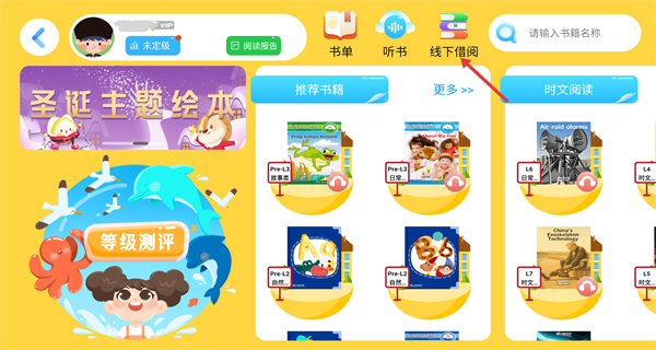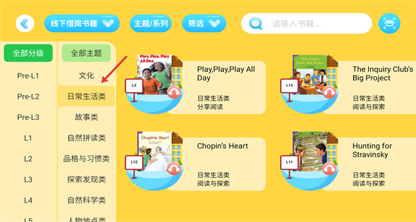 3、進入線下借閱頁面,可通過全部分級和全部主題的分類選項篩選書籍,比如選擇日常生活類等主題,查看對應分類下的書籍內容。