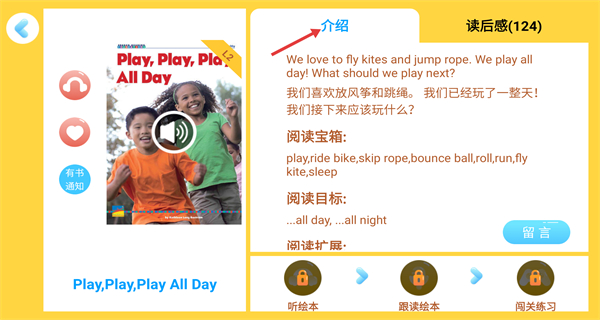 4、進入書籍詳情頁面,能查看書籍的介紹閱讀寶箱閱讀目標等內容,還可使用聽繪本跟讀繪本等功能,輔助完成該書籍的閱讀學習。