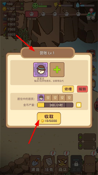 1、在營帳界面可看到居民居住情況和金幣產量,點擊收取按鈕就能獲取營帳產出的金幣,積累資源用于后續發展。