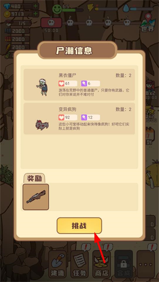 3、查看尸潮信息界面能了解黑衣僵尸等怪物的屬性和數量,點擊挑戰按鈕可參與尸潮戰斗,完成后能獲得對應的獎勵。