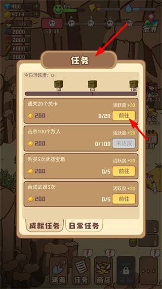 2、打開任務界面能看到各類任務,如通關20個關卡等,每個任務對應不同獎勵,點擊前往按鈕可參與對應任務的推進。