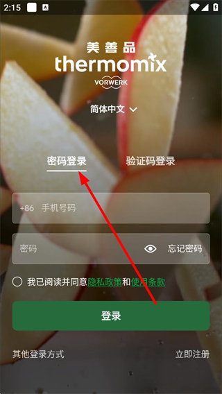 1、進入美善品登錄界面,選擇密碼登錄方式,對應輸入框填寫手機號碼和密碼,勾選協議后點擊登錄按鈕,完成賬號的密碼登錄操作。