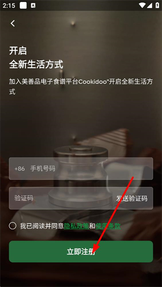 4、若未注冊賬號,點擊立即注冊按鈕,進入注冊頁面填寫手機號碼獲取驗證碼,勾選協議后完成注冊,開啟美善品電子食譜平臺的使用。