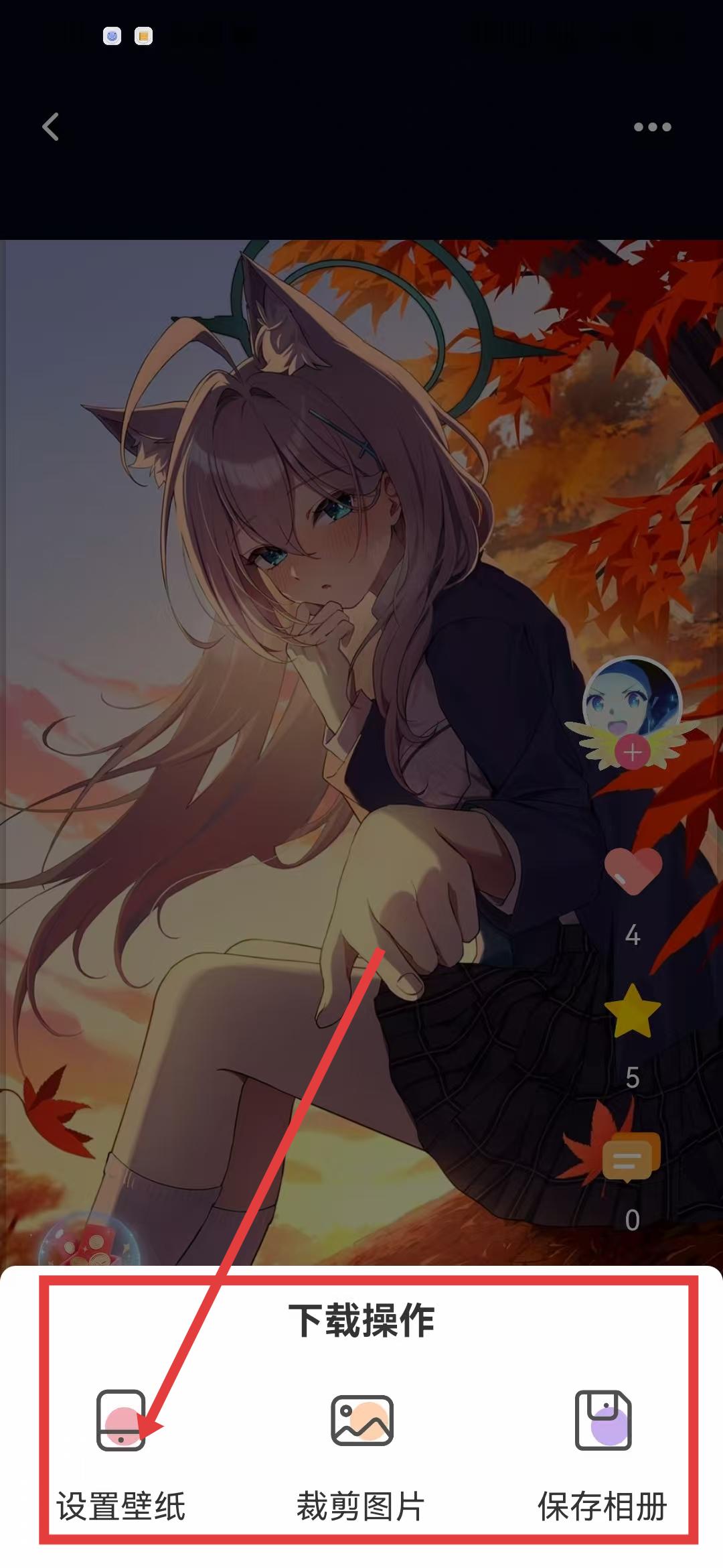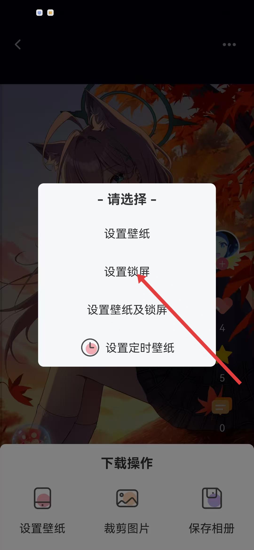 2、在彈出的下載操作菜單點擊設置壁紙選項,這一步是明確要把當前圖片用于壁紙設置,點擊后會再次彈出新的選擇框,里面有不同的壁紙應用方式。