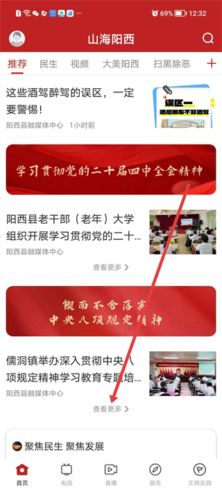 2、在推薦板塊下滑頁面查看更多資訊,包括會議精神學習活動等內容,點擊查看更多按鈕,加載并瀏覽更多相關主題的信息內容。