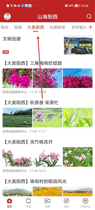 4、切換至大美陽西板塊查看該板塊下的圖文內容,涵蓋自然景觀農事活動等主題,點擊對應條目,瀏覽高清圖片及文字介紹,感受當地風貌。