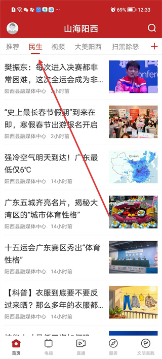 3、切換至民生板塊瀏覽該板塊下的資訊,涵蓋賽事進展假期安排天氣預警等內容,點擊對應條目,獲取具體信息,掌握民生相關動態。