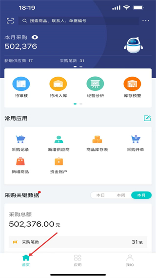 2、首頁,展示本月采購額等數據,有審核等快捷功能,常用應用含采購記錄等,助力快速開展采購相關操作。