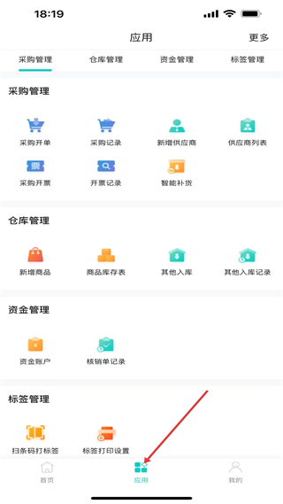 3、應用頁,分采購等管理模塊,采購模塊含開單等功能,倉庫模塊可新增商品查庫存,覆蓋多業務操作需求。