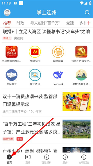 1、進入首頁界面,可查看推薦、時政等板塊的資訊,有學習貫徹黨的二十屆三中全會、文明實踐等功能入口,還有全民就業、就業資訊等服務。