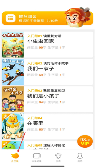 1、自己讀板塊推薦小蟲蟲回家等入門級閱讀內容,根據識字量推薦共10冊,助力孩子自主閱讀,內容貼合識字水平提升閱讀自信。