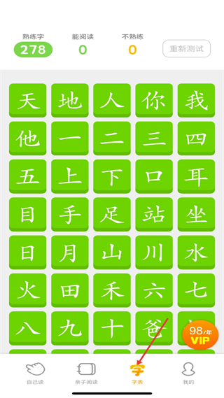 3、字表板塊展示278個熟練漢字,分類清晰,幫助孩子鞏固識字,直觀呈現識字成果,為閱讀打下堅實基礎。