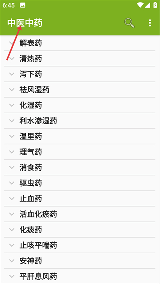 1、中醫中藥一級分類,含解表藥,清熱藥等十余類,點擊分類可展開下一層級,是查找中藥材的初始入口。