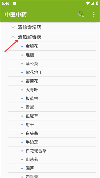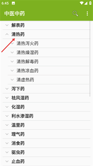 2、一級分類如清熱藥,會展開二級子分類,像清熱瀉火藥等,能縮小查找范圍,方便定位具體藥材類別。