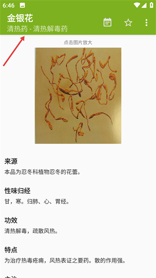 4、點擊藥材如金銀花,進入詳情頁,展示其來源,性味歸經,功效等信息,還配有實物圖片輔助了解。