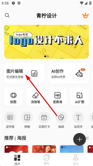 1、青檸設計首頁,選擇圖片編輯功能,該功能支持花式圖文排版,同時頁面還有創作摳圖等工具,可按需選擇對應功能開啟創作。