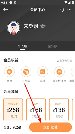4、若點擊去水印功能,會進入會員中心頁面,這里展示了個人版會員權益與套餐,如需使用該功能,可選擇對應套餐點擊立即續費開通會員。