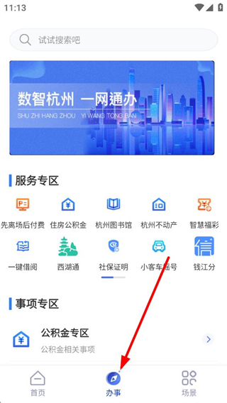 2、點擊辦事按鈕,會呈現服務專區和事項專區,服務專區有先離場后付費、住房公積金等服務,方便查找對應辦事入口。