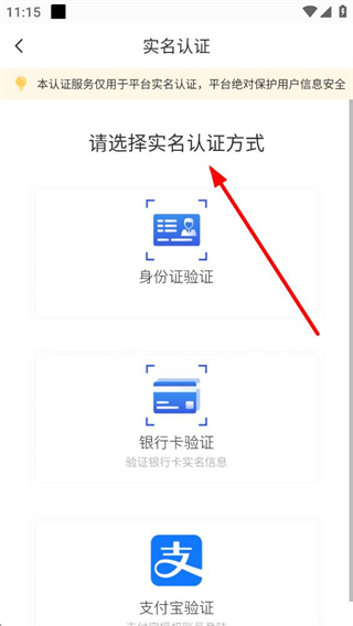 4、進入實名認證界面,可選擇身份證驗證、銀行卡驗證、支付寶驗證等方式完成實名認證,以便使用需實名的服務。