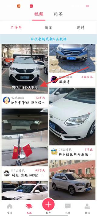 1、進入百姓網發現頁面的視頻板塊,可看到二手車、萌寵等分類,點擊二手車分類下的車輛視頻,進入車輛視頻詳情頁面。