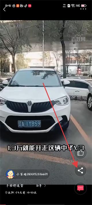 2、在車輛視頻詳情頁面可查看車輛外觀、行駛里程等信息,點擊分享按鈕可選擇聯系賣家的方式或分享渠道。