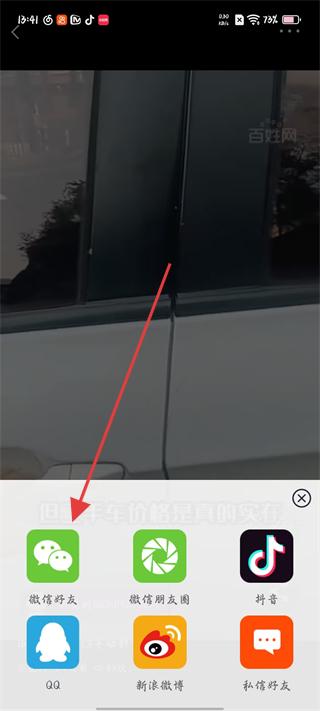4、車輛信息可選擇微信好友、微信朋友圈等分享渠道,將車輛視頻分享給他人,方便一起了解車輛情況。