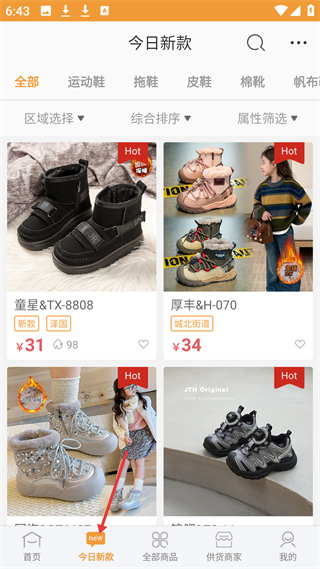 2、今日新款頁,展示童星、厚豐等品牌童鞋,有運動鞋、拖鞋等分類,標注價格和熱度,方便用戶查看新款童鞋。
