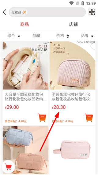 3、登錄完成后在搜索欄輸入化妝品,進入對應的商品列表頁面,瀏覽展示的化妝包等商品,選擇目標商品。