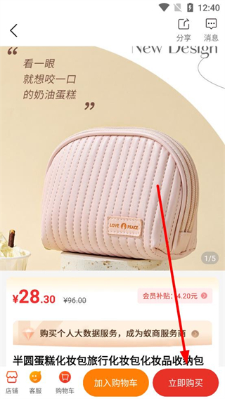 4、點擊加入購物車按鈕,將該半圓蛋糕化妝包添加到購物車,后續可在購物車中找到該商品完成結算購買。
