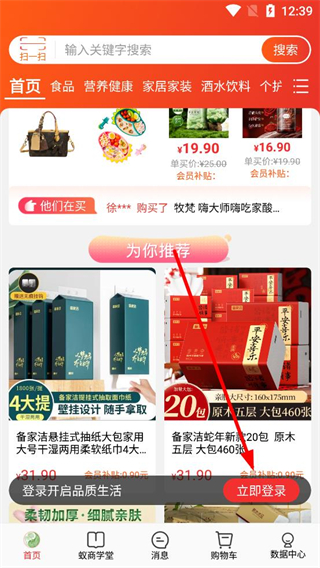 1、打開蟻商商城平臺軟件,進入首頁后找到立即登錄按鈕,登錄后可以解鎖更多的優惠商品。