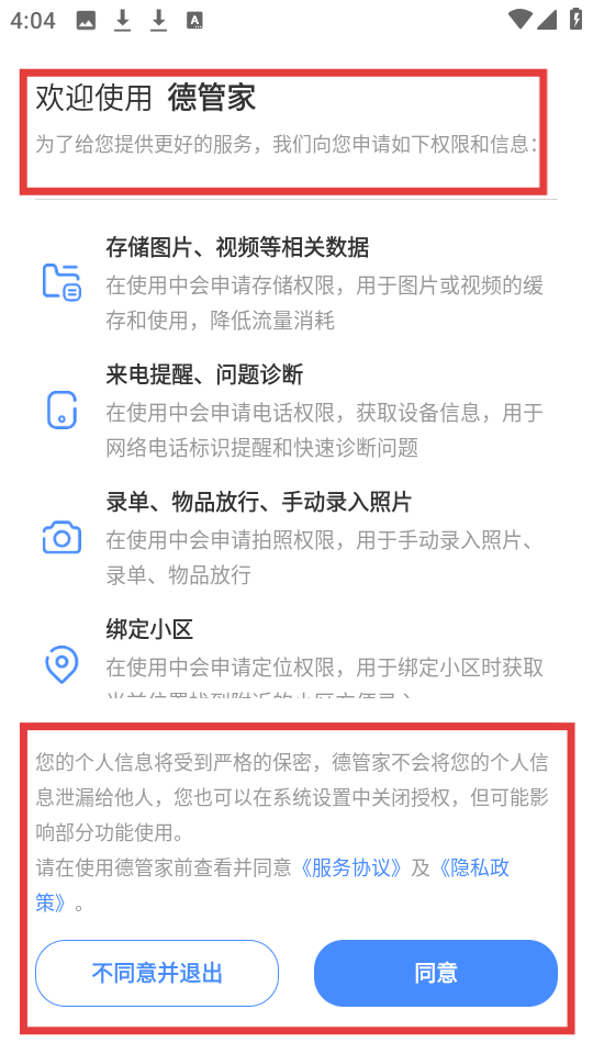1、德管家APP開啟頁,致以歡迎并申請多項權限,承諾信息保密,用戶需閱知協議政策,依同意或不同意并退出選擇操作。