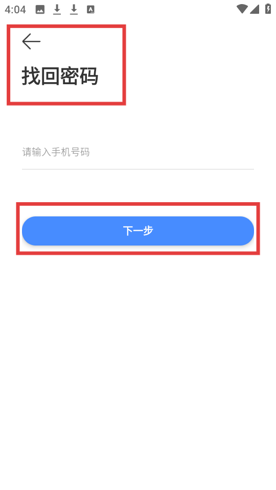 4、找回密碼頁面頂端顯示找回密碼,輸入手機號后點擊下一步,按指引重置密碼保障賬戶訪問。