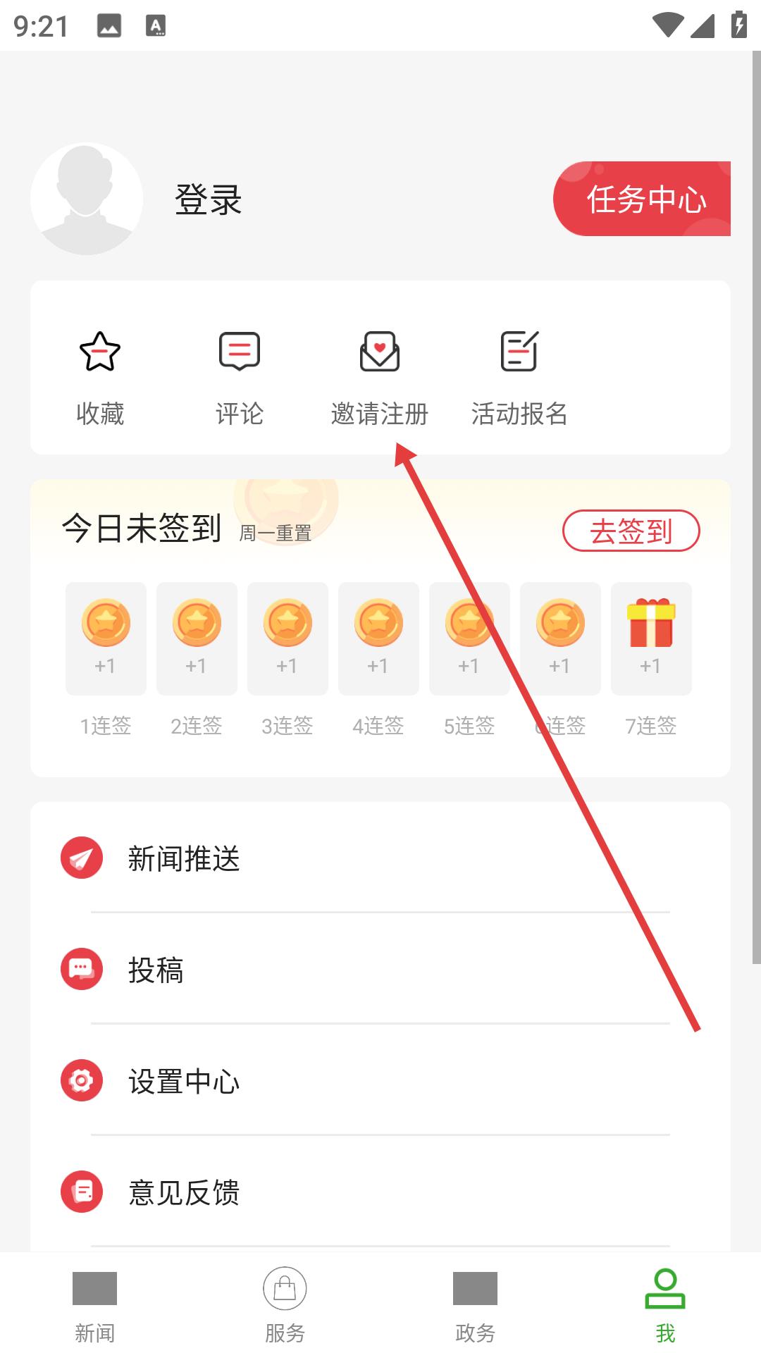 2、進入應用后,在我的頁面,能看到收藏、評論等功能,還有簽到獎勵,可點擊邀請注冊選項。