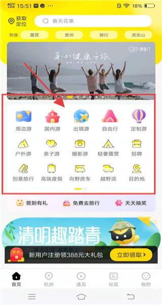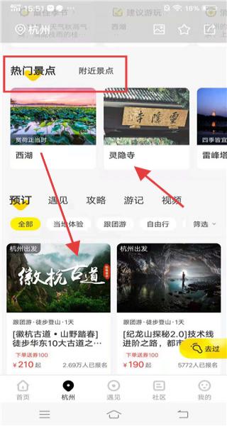 2、在首頁根據需求選周邊游國內游等旅行類型,點擊進入后查看熱門景點,附近景點,預訂跟團游,自由行等線路。