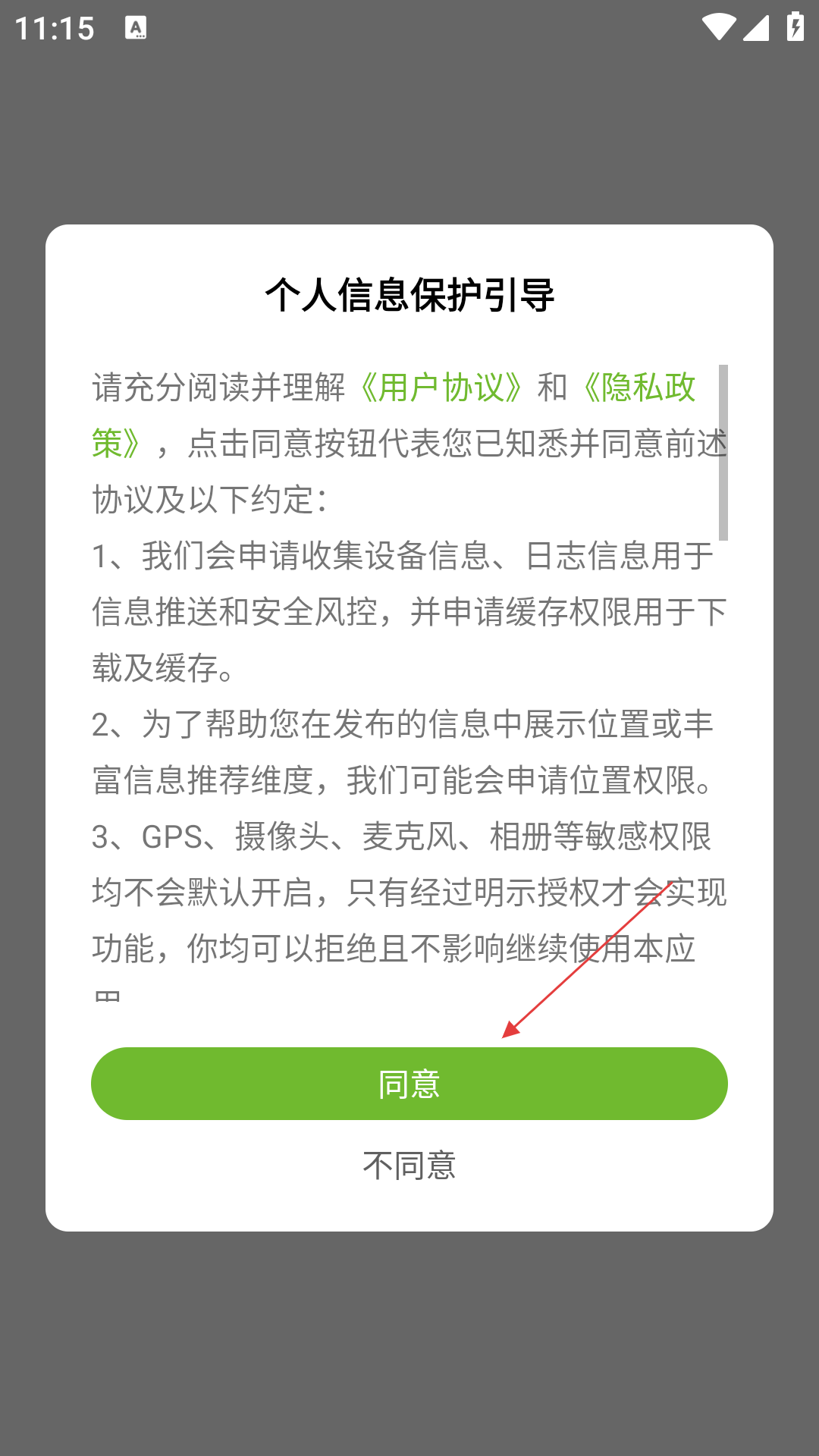1、下載安裝完成后進入,需在用戶協議和隱私政策界面點擊同意,接受相關條款后才能進入應用。