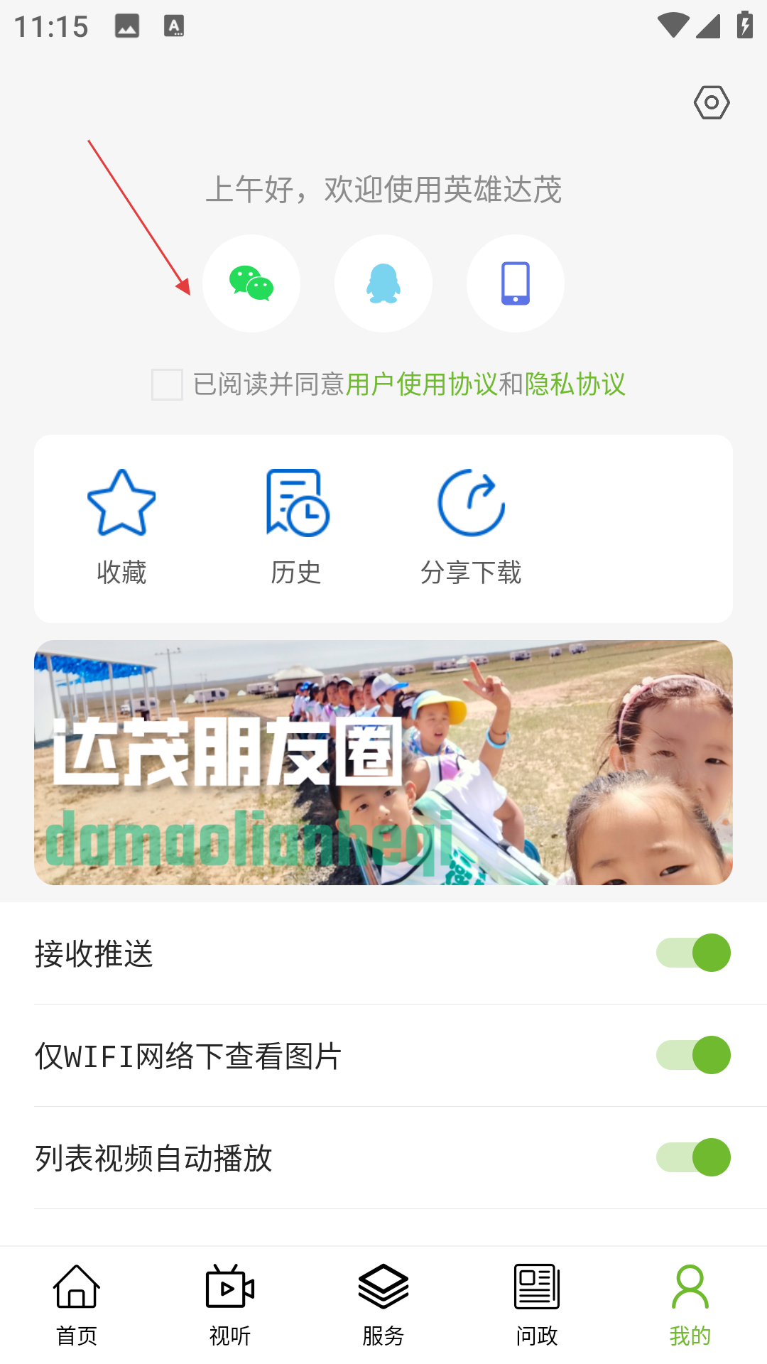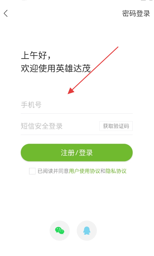 3、在英雄達茂登錄界面,填寫手機號,通過短信驗證碼方式,勾選協議,完成注冊或登錄操作,支持第三方平臺登錄。