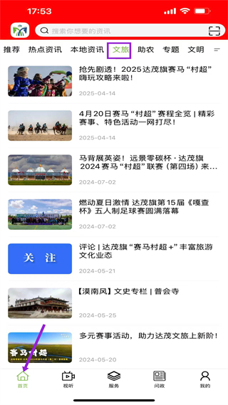 1、進入首頁文旅板塊,可看到2025達茂旗賽馬“村超”的游玩攻略、賽程全覽等資訊,了解當地特色文旅活動的相關信息。