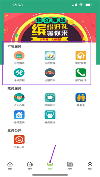 2、進入服務頁面,能看到本地服務、政務服務等板塊,涵蓋達茂酒店、餐飲、家政服務等生活服務功能,可按需選用。