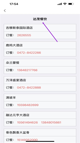 3、進入達茂餐飲頁面,可查看吉穆斯泰國際酒店、鹿鳴大酒店等多家餐飲機構的訂餐電話,方便聯系訂餐。