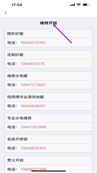4、進入維修開鎖頁面,能獲取隱形紗窗、水電暖維修等各類服務的聯系電話,便于解決生活中的維修開鎖需求。