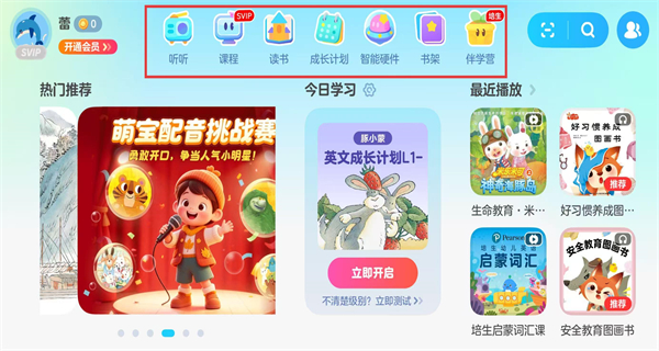 1、進入豚小蒙首頁,可見聽聽課程讀書等功能按鈕,還有熱門推薦今日學習最近播放等板塊,各類內容資源清晰呈現,點擊讀書按鈕即可進入書籍內容頁面。