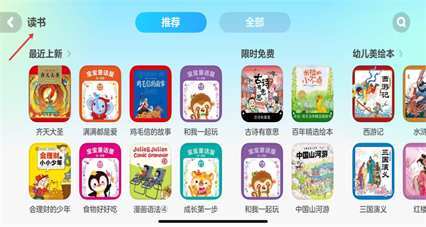 2、進入讀書頁面后,看到推薦全部兩類標簽,還有最近上新限時免費幼兒美繪本等板塊,各類書籍資源有序展示,可挑選感興趣的書籍進入其詳情頁面。