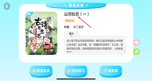 4、進入閱讀任務頁面后,可查看書籍的簡介內容,還有閱讀繪本互動練習錄故事等功能按鈕,選擇對應功能,即可開啟書籍相關的閱讀互動體驗。
