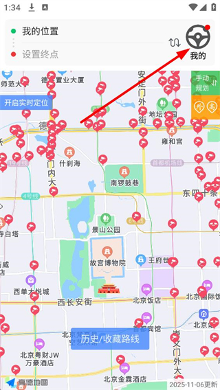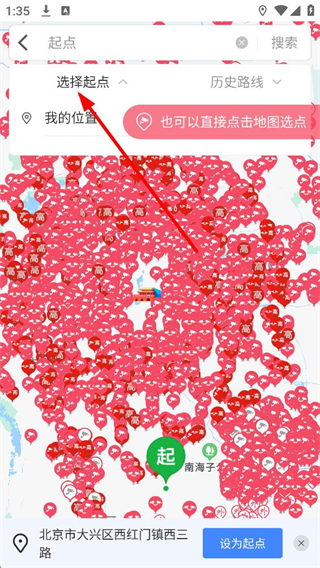 3、起點設置頁面,可選擇起點,如我的位置,也可直接點擊地圖選點,查看歷史路線,方便用戶確定出發位置。
