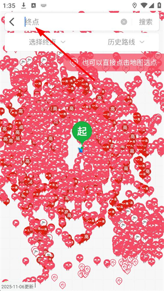 2、終點設置頁面,可搜索欄輸入終點名稱,也可直接點擊地圖選點,還能查看歷史路線,便于用戶快速設置目的地。