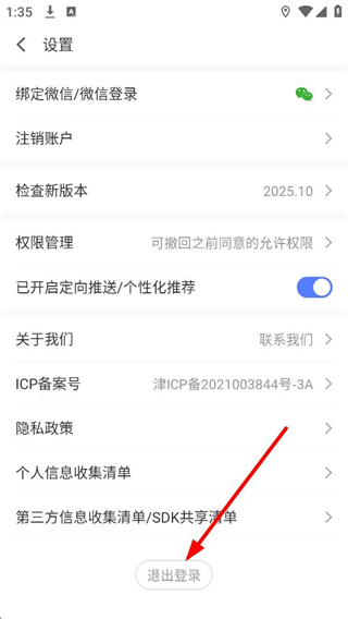 4、進入設置頁面,可進行綁定微信、微信登錄、注銷賬戶、檢查新版本等操作,還有權限管理、定向推送設置等功能,底部有退出登錄按鈕。
