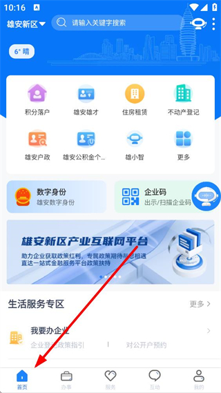 1、進入首頁可看到雄安新區相關服務入口,如積分落戶、雄安雄才、住房租賃等,還有數字身份、企業碼等功能板塊,生活服務專區可辦理企業相關業務。
