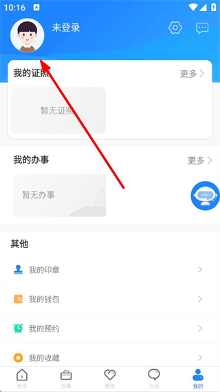 2、點擊我的進入個人界面,可查看我的證照、我的辦事等信息,還有我的印章、錢包、預約、收藏等功能,未登錄狀態下可進行登錄操作。
