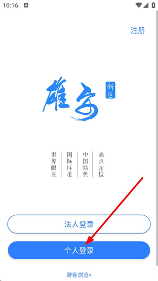 3、登錄界面可選擇個人登錄或法人登錄,也可選擇游客瀏覽,若為新用戶可點擊注冊,進入注冊流程。