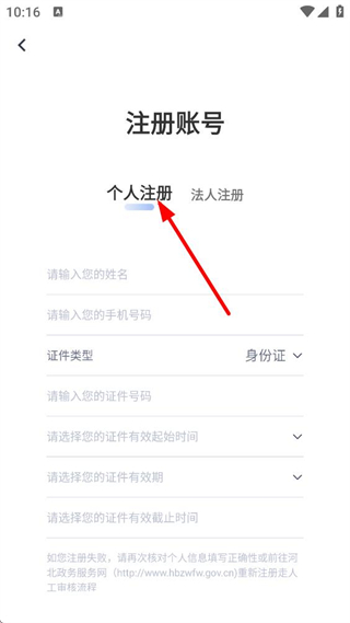 4、進入注冊賬號界面,可選擇個人注冊,需輸入姓名、手機號碼、證件號碼等信息,選擇證件有效時間,按提示完成注冊即可使用雄安政務服務。
